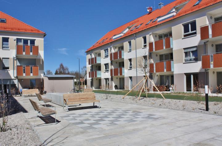 Die beiden Gebäude mit den pflegegerechten Eigentumswohnungen umschließen einen wunderschönen Garten-Hof und beherbergen vorwiegend Zwei- und Drei-Zimmer-Wohnungen mit einem gemeinsamen Clubbereich im Erdgeschoss und einer Tiefgarage.