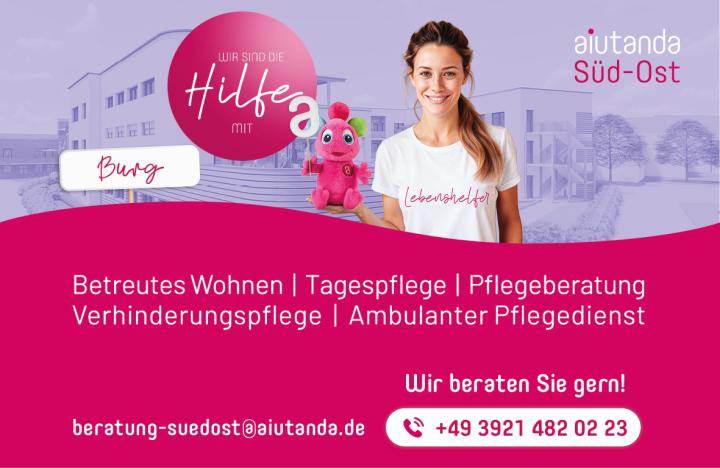 Der aiutanda Lebenspark "Am Roland" in Burg bietet 57 moderne und barrierefreie Apartments im Bereich des Servicewohnens sowie des Betreuten Wohnens. Das Angebot erstreckt sich zudem auf eine angeschlossene Tagespflege mit 56 Plätzen, die auch von externen Besuchern genutzt werden kann. Um den Bewohnern zusätzlichen Komfort zu bieten, steht ein Hol- und Bringdienst zur Verfügung, der sowohl den morgendlichen Abhol- als auch den abendlichen Rücktransportservice gewährleistet.
