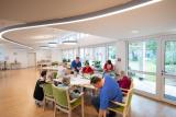 Gemeinschaftsräume befinden sich auf allen Etagen. Ein Speisesaal ist zentral gelegen und von allen Wohnbereichen mit dem Fahrstuhl gut erreichbar. Die Cafeteria lädt freitags mit frischen Waffeln und sonntags mit Torte zum Verweilen auch mit Gästen ein. Auf einer überdachten Terrasse kann man geschützt die Natur genießen. Der schön angelegte Garten lädt mit seinen Wegen zu Spaziergängen ein. Für an Demenz erkrankte Bewohner ist ein spezieller Teil besonders geschützt angelegt und strukturiert.