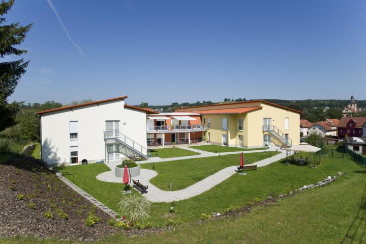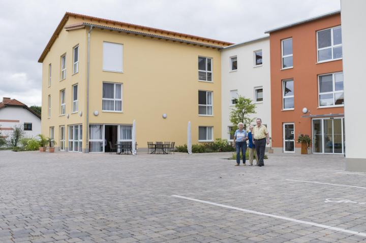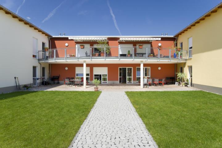 Zwei Vorzüge kennzeichnen die Lage des Pflegeheims: ruhig und mittendrin. Hier wohnen die Bewohnerinenn und Bewohner abseits von Druchgangsstraßen und sind dennoch zentrumsnah. Geschäfte oder Institutionen sind fußläufig zu erreichen. Gegenüber des Haupteingangs, gleich in Sichtnähe, befindet sich der Kidnergarten der Gemeinde. Beide Einrichtungen teilen sich den schön gestalteten Vorplatz, der zu Begegnungen zwischen den Generationen einlädt. Beeindruckend ist die schöne Aussicht auf herrliches Fachwerk und in das Dimbachtal.