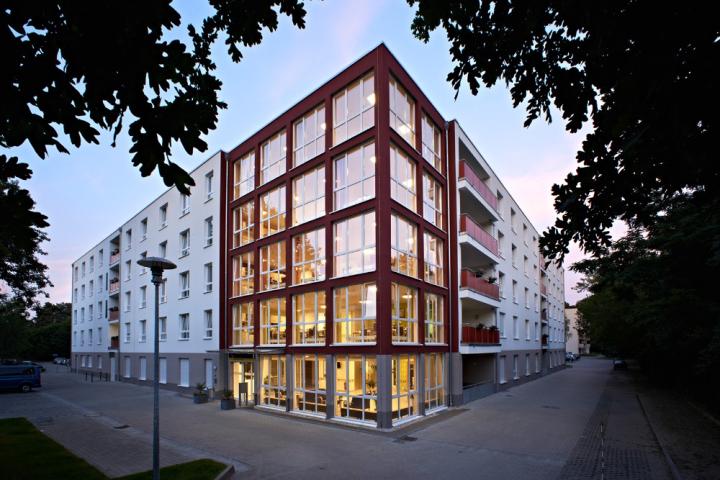 Die einladend und überschaubar gestaltenen Wohnbereiche verfügen über großzügige Aufenthaltsbereiche mit schönen Balkonen, die das Erleben von Gemeinschaft ermöglichen und fördern. Ein besonderes Beleuchtungssystem trägt zusätzlich zum Wohlbefinden der Bewohner bei, indem es den natürlichen Tagesverlauf simuliert.
