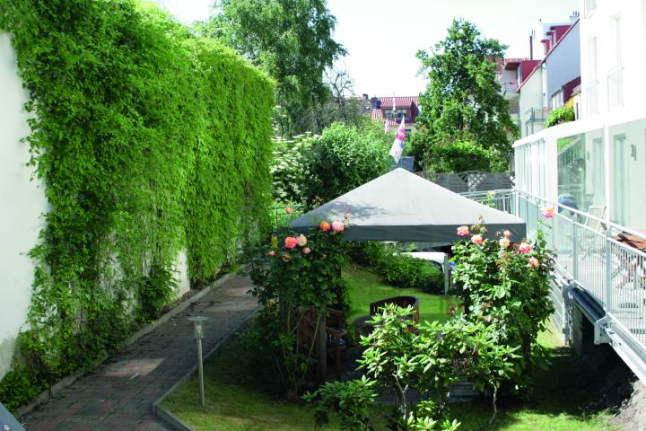 Im Hinterhof unseres Hauses haben wir einen kleinen Garten angelegt. Darüber hinaus können Bewohner und Angehörige auf der Dachterrasse die Sonne und entspannte Stunden genießen.