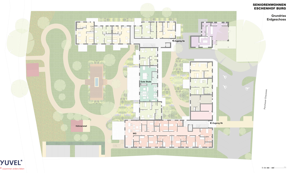 Auf dem Grundstück am Rande des Naturschutzgebietes Burger Holz, befinden sich die Gebäude des Seniorenwohnens Eschenhof. Auf einer Fläche von etwa 5.500 Quadratmetern soll eine bewusste Verbindung zwischen Mensch und Natur geschaffen werden. Den Bewohnern steht ein sehr großer Garten mit Beeten, Obstbäumen und einem Hühnerhaus zur Verfügung. Hier können sie sich zum einen auf eine Bank setzen und die Sonne genießen und Freunde treffen. Zum anderen besteht die Möglichkeit, sich aktiv an der gärtnerischen Gestaltung und zum Beispiel der Ernte zu beteiligen. Interessierte Bewohner können die auf dem Gelände lebenden Tiere mitversorgen. Haustiere der Mieter sind ebenfalls herzlich willkommen.