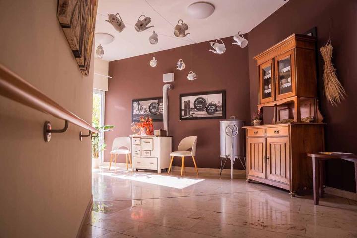 Im Erdgeschoss ist die Tagespflege mit separaten Räumen für insgesamt drei Gruppen, gemeinsamem Ruheraum und Speisesaal untergebracht. In den drei Etagen darüber findet das gemeinschaftliche Wohnen mit der Langzeit- und Kurzzeitpflege statt. Jede Etage des Pflegeheim Singen unterscheidet sich von der anderen durch unterschiedliche Farbkonzepte. Die Fußböden sind weitgehend mit Teppichböden belegt, um so eine wohnliche Atmosphäre zu schaffen. Jedes Stockwerk verfügt über einen gemeinsamen Speisesaal, einen Aufenthaltsbereich, Therapieräume, Funktionsräume, Lagerraum und selbstverständlich einen Pflegestützpunkt.