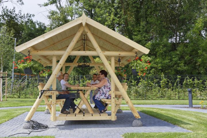 Im Außenbereich laden der Sinnesgarten und die große Schaukel zum Ausprobieren und Entspannen ein; ein umhegter Bereich, der dem Bewegungsdrang der Bewohner Rechnung trägt.