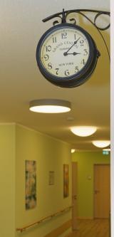 Wir arbeiten mit einem Farbkonzept. Die Farben Jade und Blau in den Bewohnerzimmern beruhigen die Bewohner. Die Farben Gelb und Orange strahlen Behaglichkeit und Wärme aus. Sie wirklen motivierend und stimulierend. Auch mit Grün wird gearbeitet. Es harmonisiert und beruhigt, ohne aufmerksam zu machen. Jeweils eine Wand in den Räumen ist in einem dunkleren Farbton gehalten. So erhalten die Bewohner zusätzlich Anreize und Orientierung.